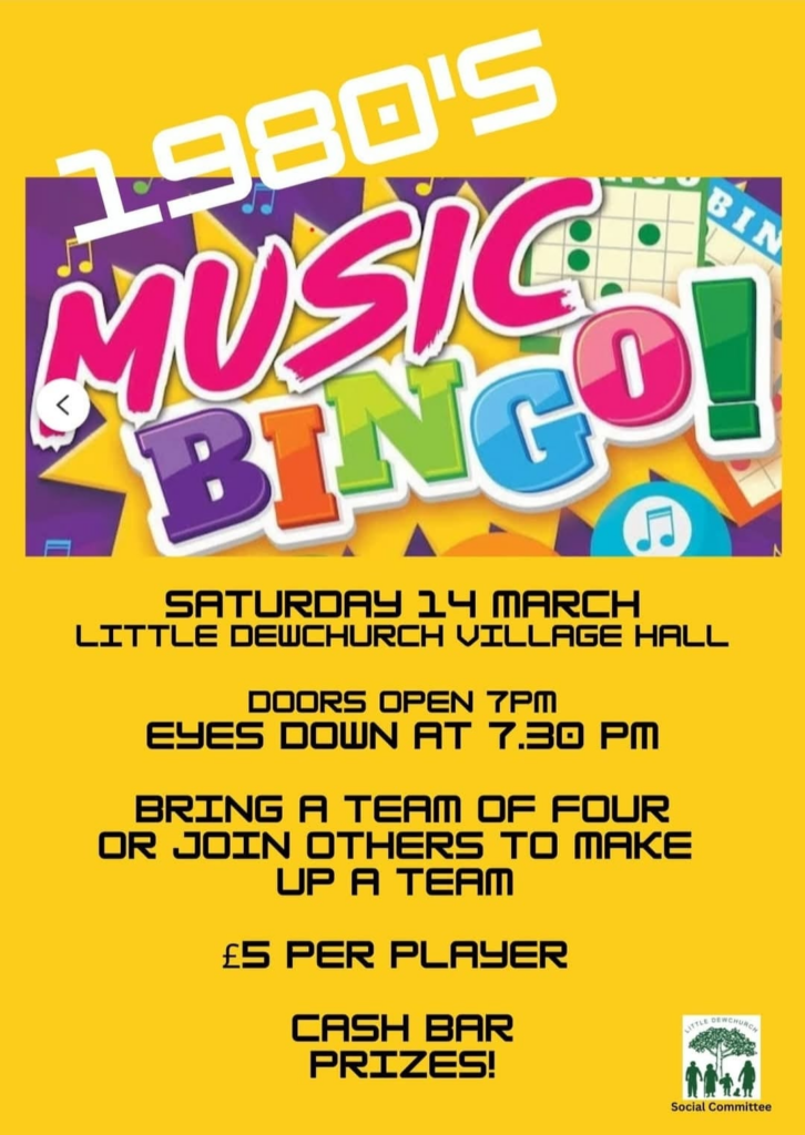 Taking place in the village hall on Saturday 14 March, bring your ‘dabbers’ to tick off your favourite 80s tunes!